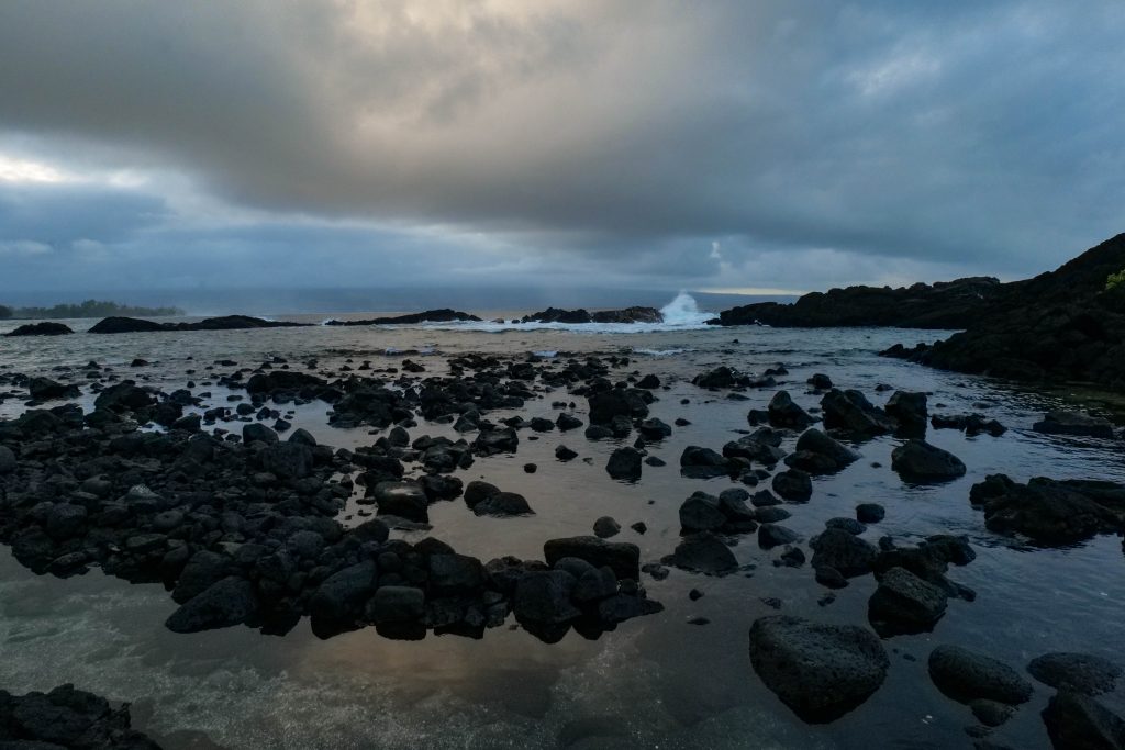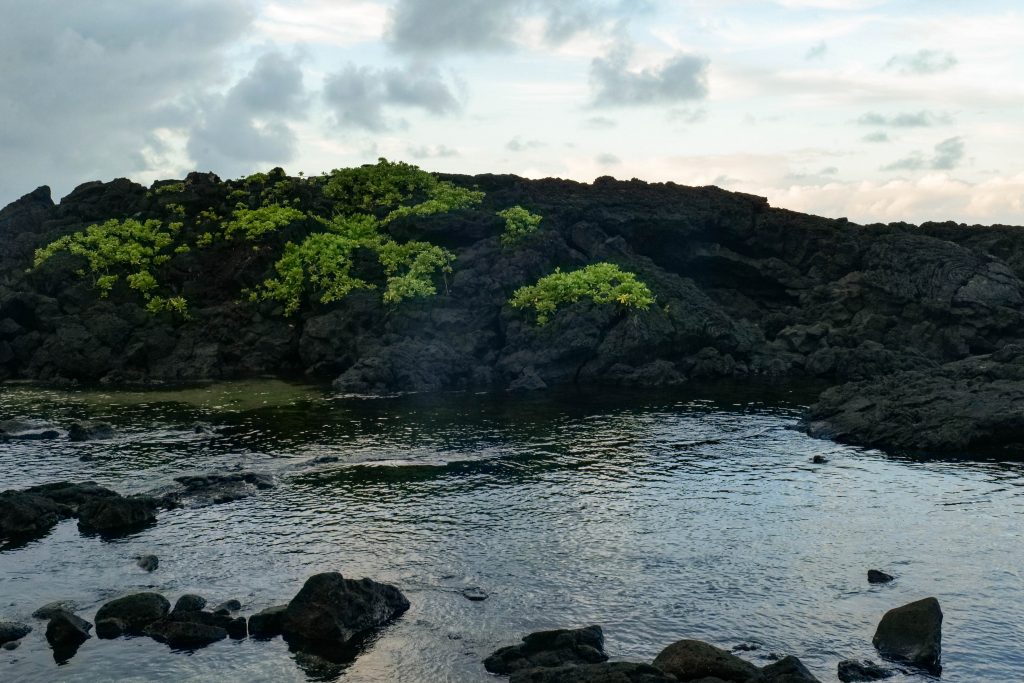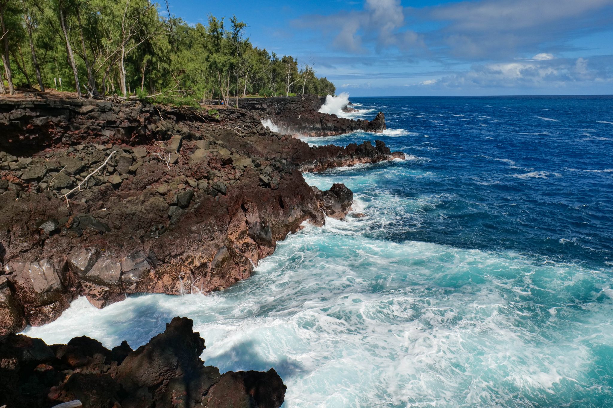 Le bord de mer dans la ville de Hilo, est formé de grande vasques creusées par l’océan dans la lave.