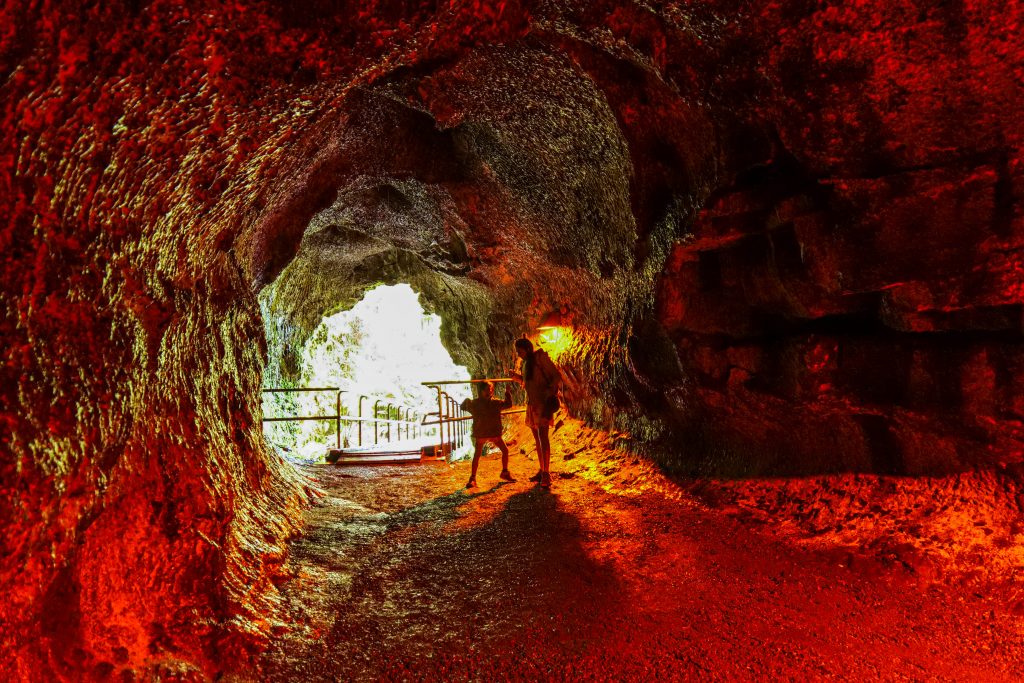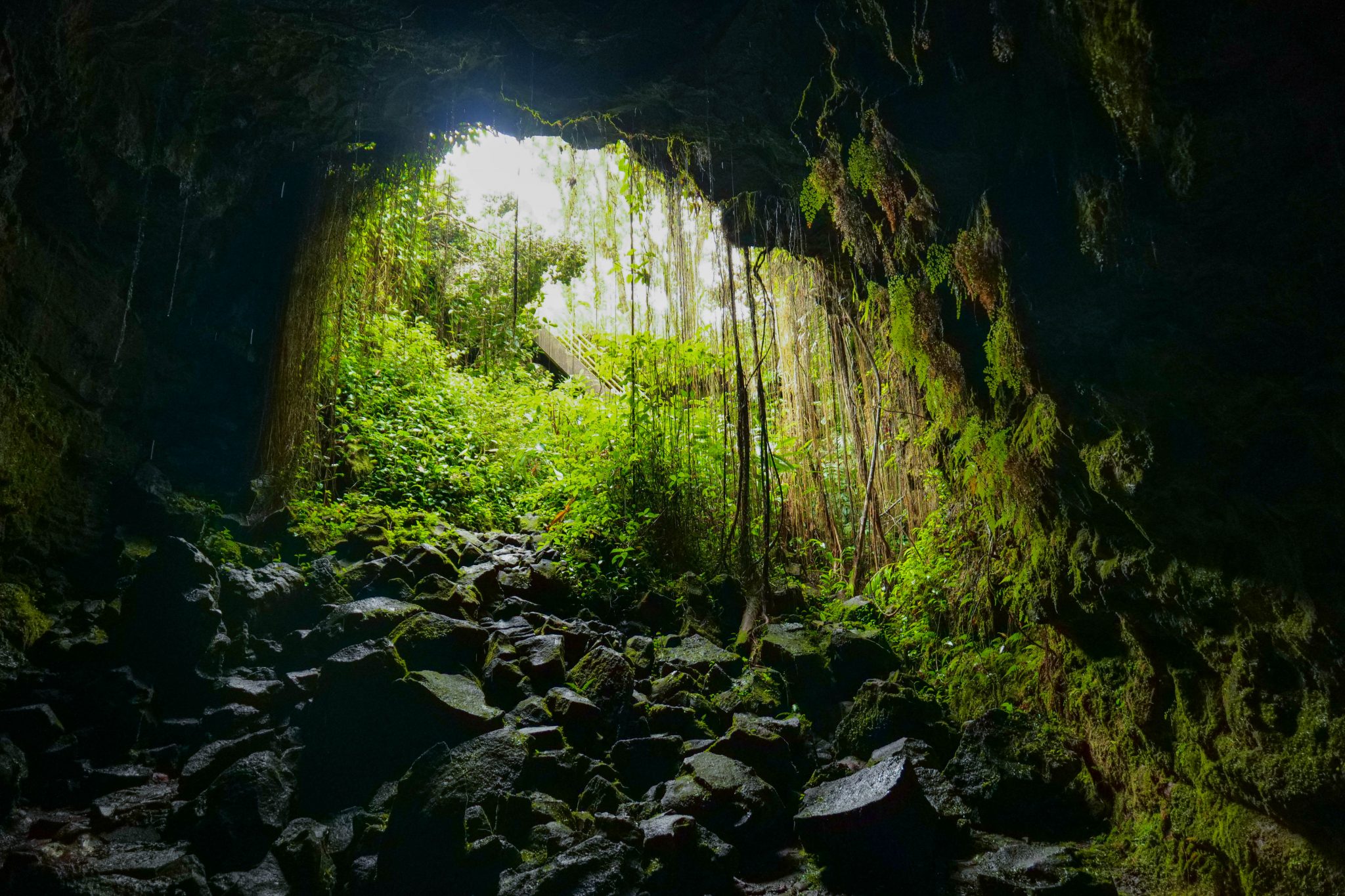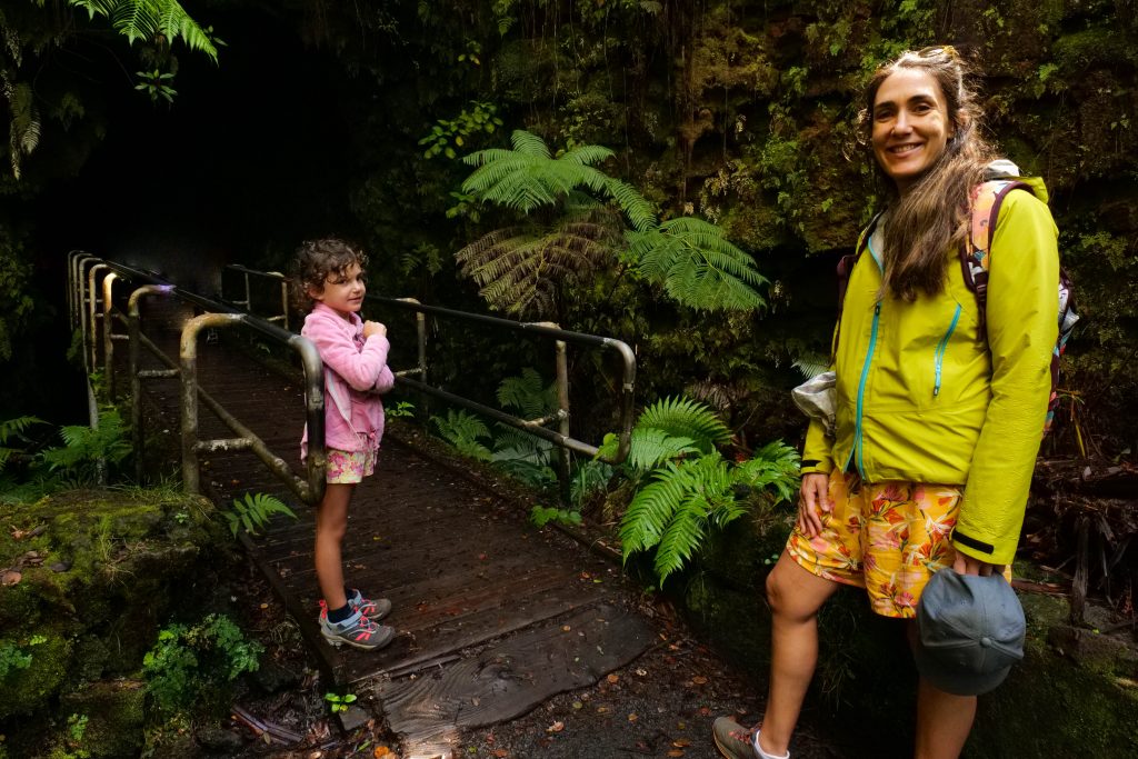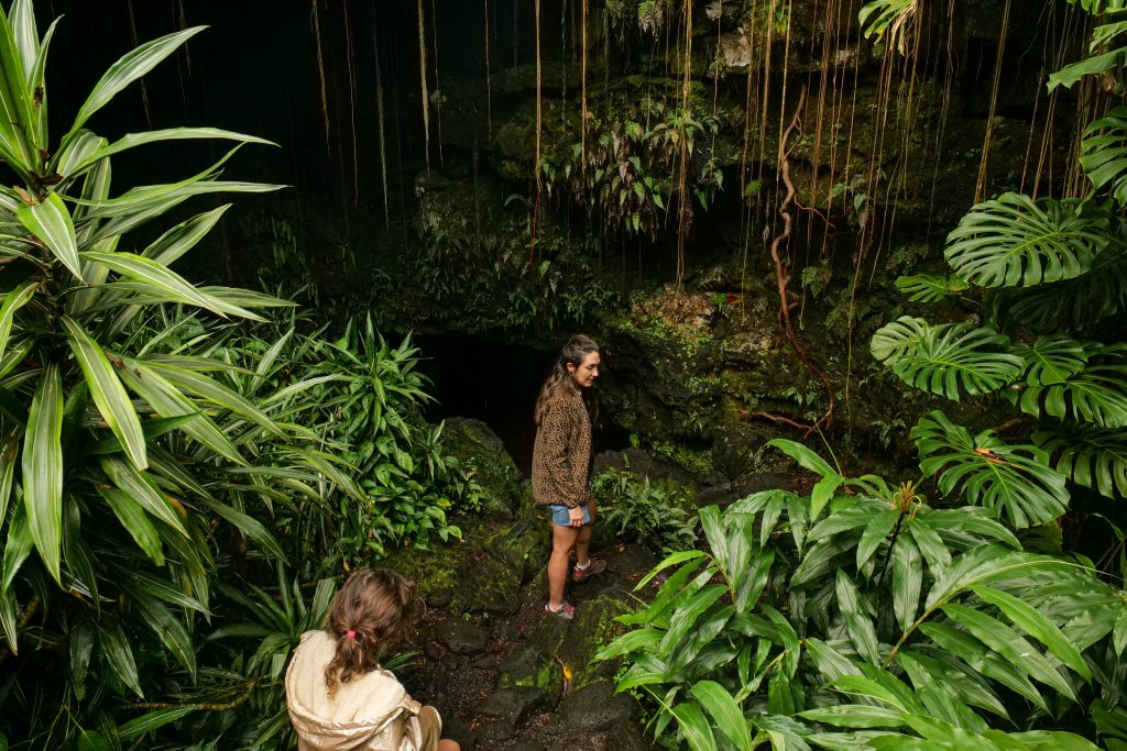 On continue le tour avec une petite marche en bordure de cratère, dans la forêt, jusqu’à un petit tunnel de lave sympa