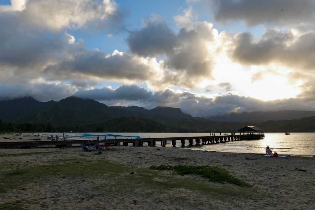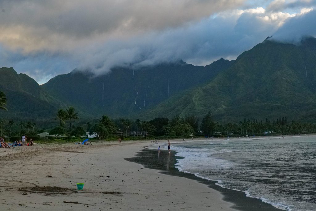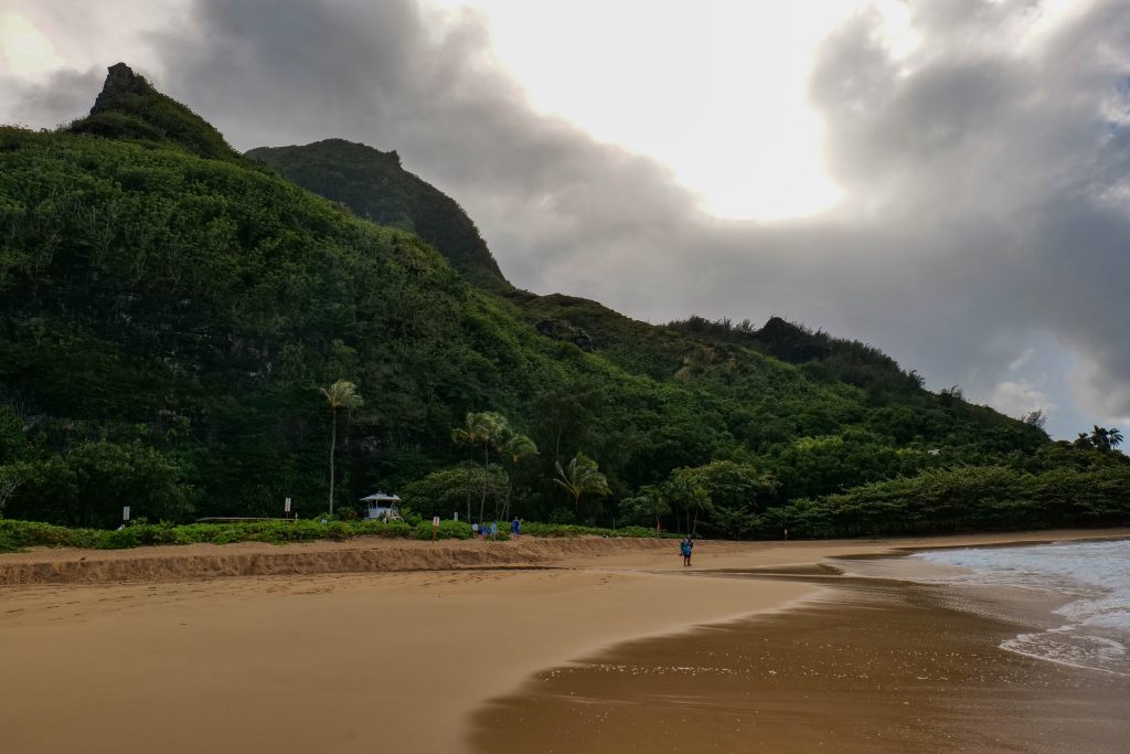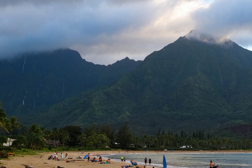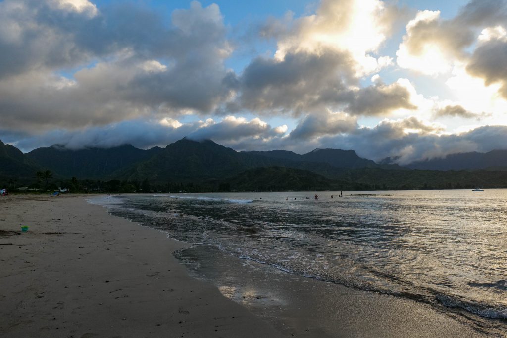 On fini par la plage de Hanalei, magnifique anse entourée de montagnes. Haut lieu du surf à Hawai’i.